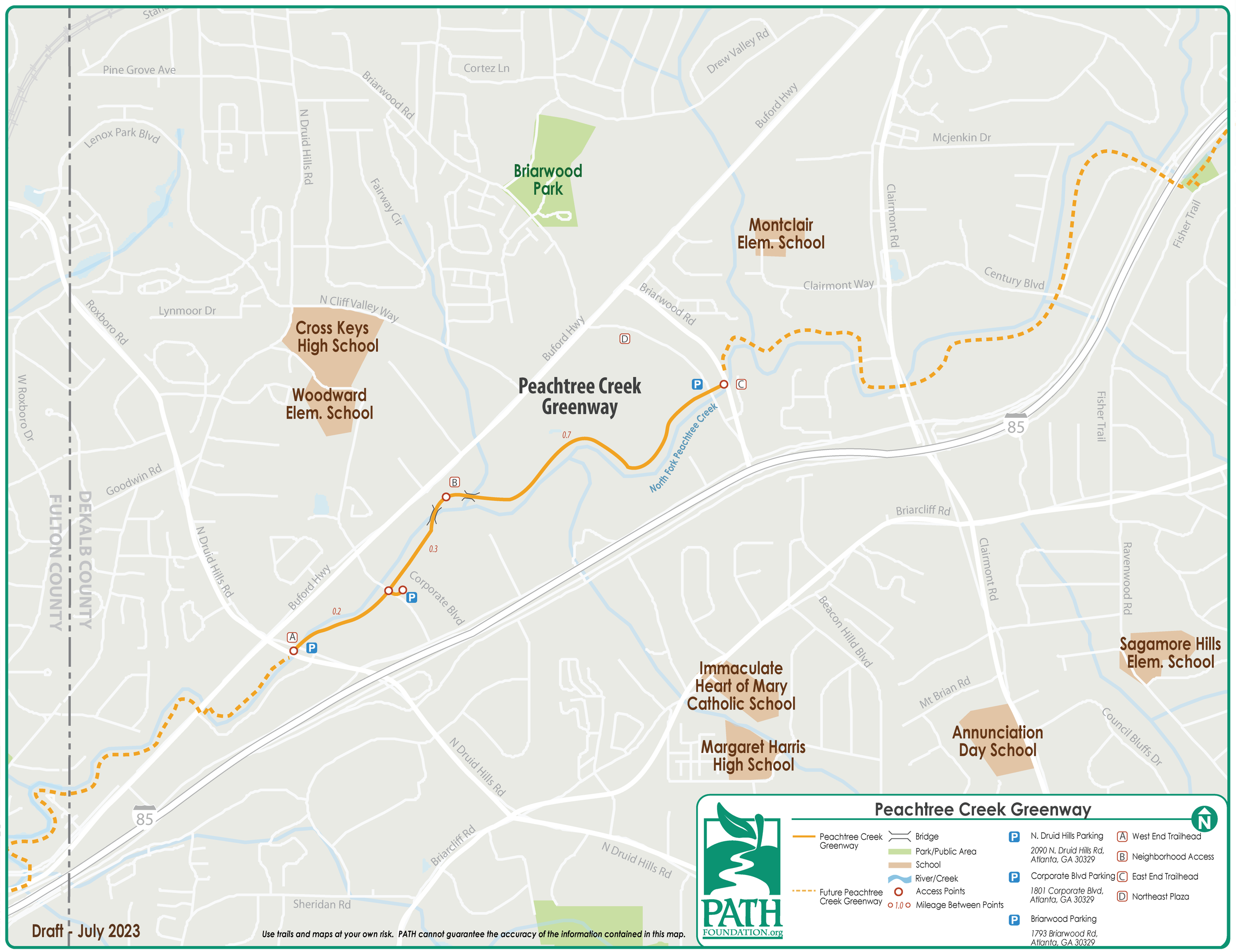 Major Parking/Access Points: Trailheads on North Druid Hills, Corporate Boulevard, Briarwood Road